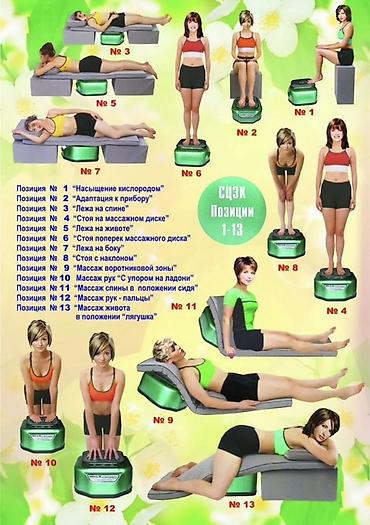 - На наглядной схеме указаны 13 позиций: «насыщение кислородом», «адаптация к прибору», «лёжа на спине», «стоя на массажном диске», «лёжа на животе», «стоя поперёк диска», «лёжа на боку», «стоя с наклоном», «массаж воротниковой зоны», «массаж рук с упором на ладони», «массаж спины сидя», «массаж рук — пальцы», «массаж живота в положении “лягушка”».