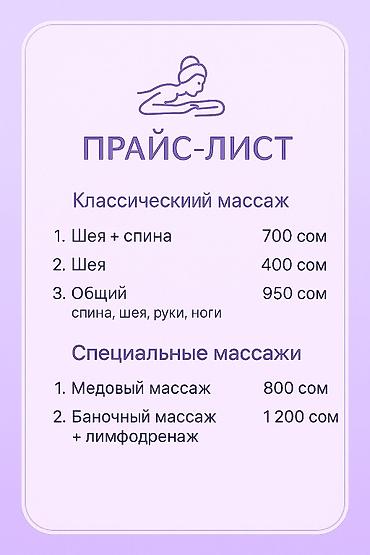 Услуги массажа Классический массаж: - Спина — 750 сом - Шейно-воротниковая зона — 450 сом - Общий массаж — 999 сом Лечебный массаж: - Стоимость определяется индивидуально Описание: - Направлен н...