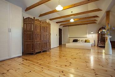 - Преимущества: теплая на ощупь, хорошая звуко- и теплоизоляция, экологичность, легко обновляется циклевкой, устойчива к бытовым нагрузкам.