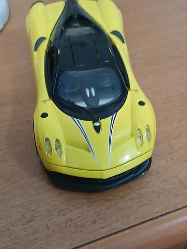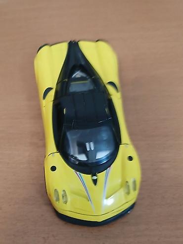 Масштабная модель Pagani Huayra — коллекционная миниатюра суперкара в ярко‑жёлтом цвете с чёрной крышей и контрастными гоночными полосами в цветах итальянского флага на капоте.
