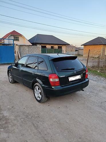 Mazda 323F хэтчбек (5 дверей), темно‑зеленый цвет. Практичный семейный автомобиль с просторным салоном и большим багажным отсеком.