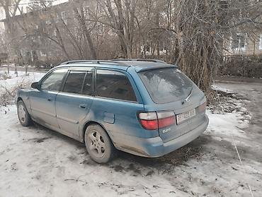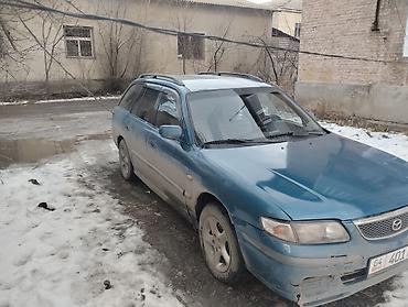 Mazda 626 Wagon (универсал), синий цвет кузова. Пятидверный семейный автомобиль с большим багажным отсеком и рейлингами на крыше для крепления боксов/багажников.