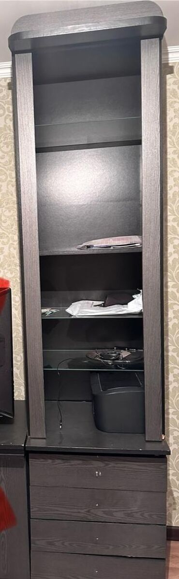 Мебельная стенка в современном стиле, выполненная в темно-сером цвете под дерево. Конструкция включает множество секций для хранения: закрытые шкафы, открытые полки и витринные отделения со стеклянными дверцами. Центральная часть предусмотрена для размещения декоративных элементов. Такой комплект станет функциональным решением для гостиной или зала, позволяя удобно организовать пространство и хранить различные предметы быта и декора.