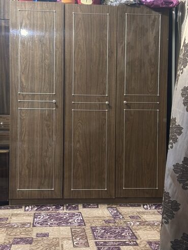 Большое 5000 , маленький шкаф 4000сом Мебельная стенка из нескольких секций, выполненная в коричневых тонах под дерево. Включает шкаф с тремя дверцами, отделение с застекленными дверцами для посуды или книг, а также секции с выдвижными ящиками и полками. Подходит для гостиной или спальни, обеспечивая достаточно места для хранения и демонстрации предметов.
