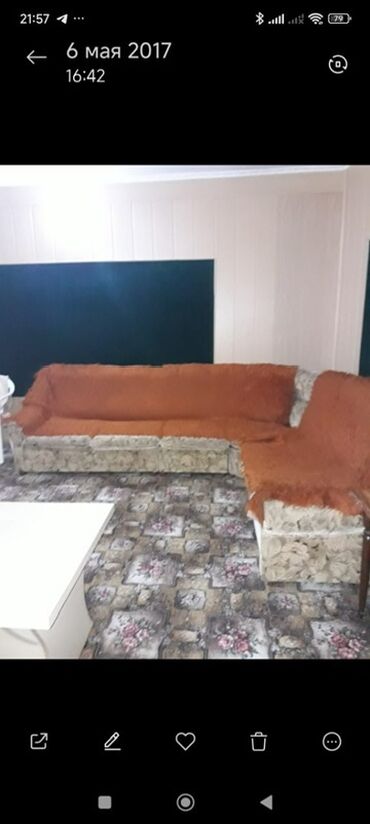 - Угловой диван крупного размера. Каркас с мягкими подушками сидений и спинки, модульная Г‑образная форма, подходит для гостиной. Обивка с цветочным рисунком, сверху — съёмные покрывала.