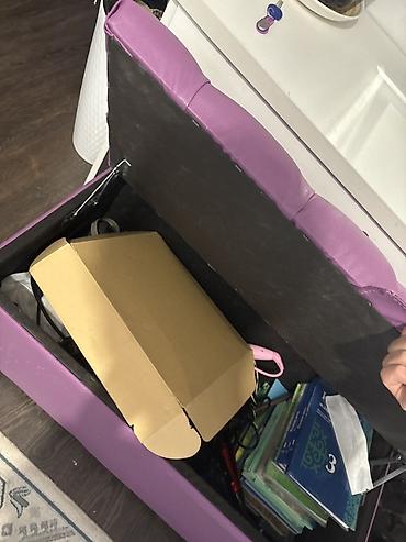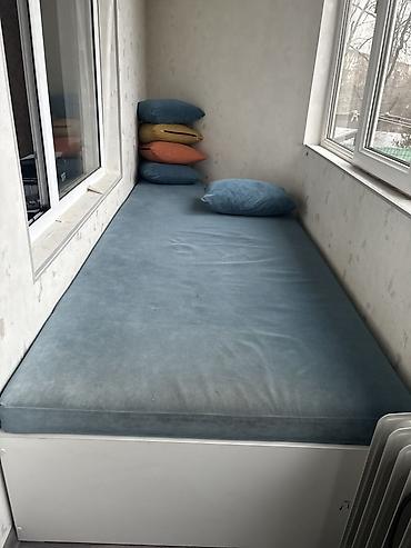 - Узкая диван-лежанка/кровать-день на лоджию или нишу: высокая мягкая подушка-матрас голубого цвета, белое основание с бортами; подойдёт для отдыха или спального места. Несколько декоративных подушек.