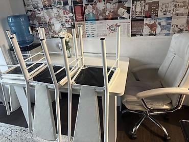 - Письменный/рабочий стол белого цвета прямоугольной формы. На фото также белое офисное кресло на колёсной базе с регулируемой высотой и подлокотниками.