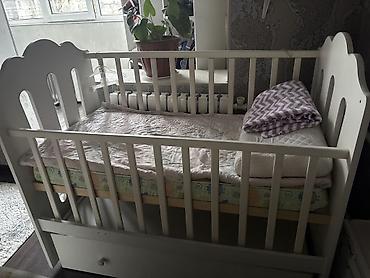 - Детская кроватка-колыбель белого цвета со съёмными/опускающимися боковинами, нижним выдвижным ящиком для хранения. В комплекте видно матрас и наматрасник.