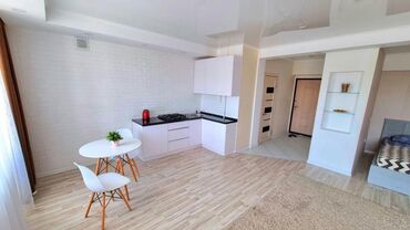 Сдаётся современная квартира-студия с качественным ремонтом в светлых тонах. Что внутри: - Кухонная зона с новой модульной мебелью, черной столешницей, фартуком под мрамор, врезной мойкой и нескол...