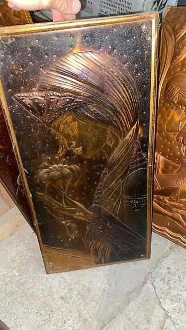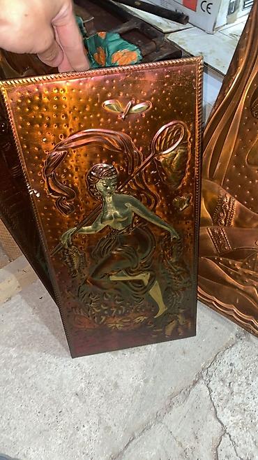 Набор декоративных рельефных панно, выполненных из меди. Каждое панно украшено уникальным изображением, созданным методом чеканки. Изображения включают женские фигуры, природные мотивы и элементы мифологии. На поверхности меди видны цветовые переливы от красного до зеленого, что придает каждому элементу дополнительную глубину и винтажный вид. Эти панно станут выразительным акцентом в интерьере, подходящим для оформления стен в гостиной, прихожей или кабинете, добавляя пространству изысканности и художественной ценности. Отлично подходят для любителей уникального декора и изделий ручной работы.