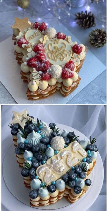 На фото также пример рулета меренгового с ягодами и праздничных тортов‑цифр/фигур с тематическим декором.