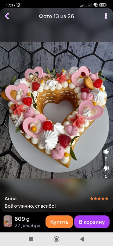 - Диаметр торта — на подложке, форма полого сердца с вырезом внутри.