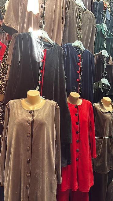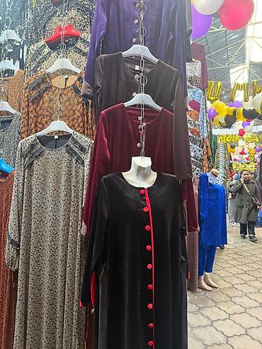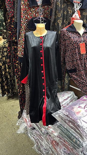 - Женские платья: прямой силуэт из мягкого бархата, длина миди. Основной цвет — черный, контрастная красная планка спереди с крупными обтяжными пуговицами; есть варианты в близких бархатных тонах (бордовый, фиолетовый и др.). Рукав длинный, удобные карманы по бокам. Ткань плотная, с благородным блеском, комфортная для повседневной носки и торжеств.