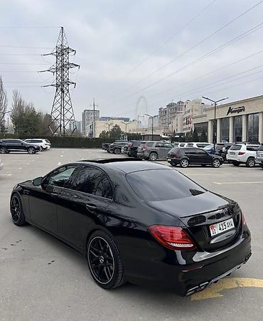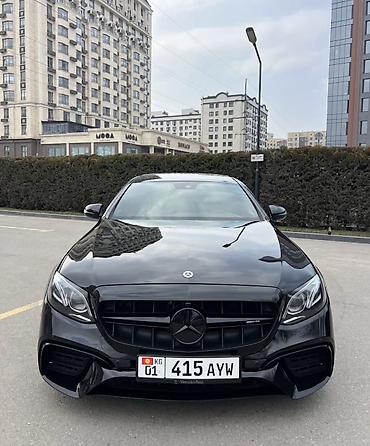 Mercedes‑Benz E‑Class (W213), черный седан бизнес‑класса. Ключевые особенности: - Эффектный AMG‑стиль: спортивные бамперы, хромированная решетка радиатора, шильдик AMG на номерной рамке - Светодио...