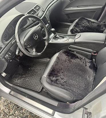 Mercedes-Benz E‑Class W211, серебристый седан (рестайлинг дорестайл с «двойными» фарами). Характеристики и оснащение: - Кузов: 4‑дверный седан, серебристый металлик - Легкосплавные многоспицевые ...