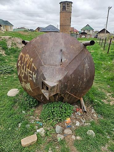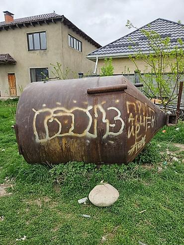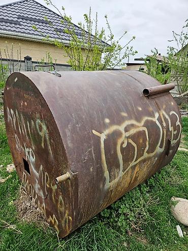 Металлическая емкость-цистерна цилиндрической формы. Характеристики: - Материал: сталь - Ориентировочный объем: около 2–3 м³ (по габаритам на фото) - Конструкция: горизонтальная, с торцевыми заглу...