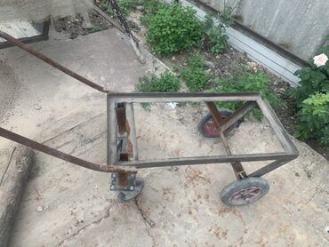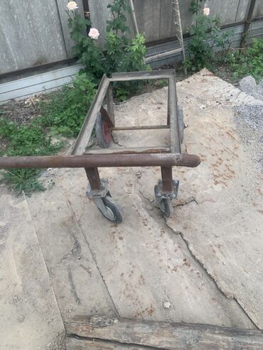 Тележка на колесах из металлического профиля. Предназначена для перевозки различных грузов. Оснащена поворотными колесами для удобства маневрирования. Металлическая конструкция обеспечивает прочность и надежность. Может использоваться в саду, на складе или в мастерской.
