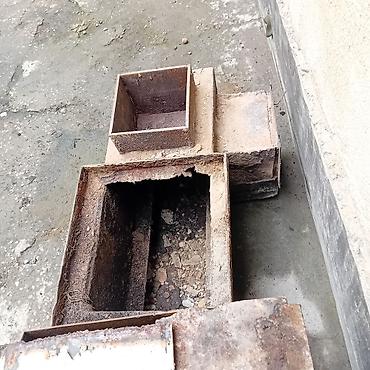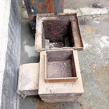 - Комплект сварных коробов из толстостенного металла: две секции квадратного сечения (камера сгорания/зольник) и вертикальный бакоподобный модуль с круглым патрубком для отвода дыма.