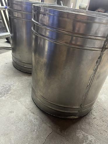 Нержавеющая ёмкость/бак цилиндрической формы. Характеристики: - Материал: нержавеющая сталь - Форма: вертикальный цилиндр с плоским дном - Высота: около 80 см (по рулетке) - Внутренний диаметр: ок...
