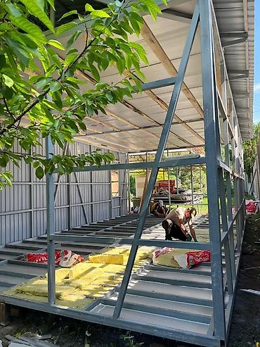 На фото: пример павильона с витражами и ярким фасадным коробом, этапы сборки металлического каркаса и внутреннего утепления ППУ. Подходит для размещения на автостоянках, рынках и уличных площадках.