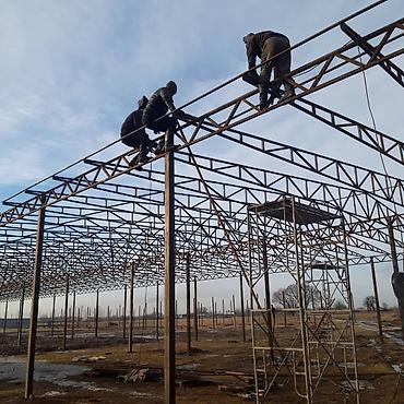 - Монтаж на открытых площадках круглый год: сборка на высоте, стыковка секций, установка прогонов под кровлю.