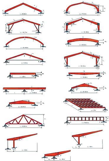 - Типы решений: фермы и рамы различной формы (двускатные, односкатные, арочные, полуарки, пролетные балки, висячие и на опорах, прогоны и обрешетка). Возможны декоративные элементы.