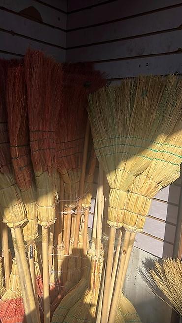 - Натуральные венички/метлы из сорго: плотная прошивка, связка в несколько рядов, деревянные черенки; удобны для подметания пола, крыльца, гаража.