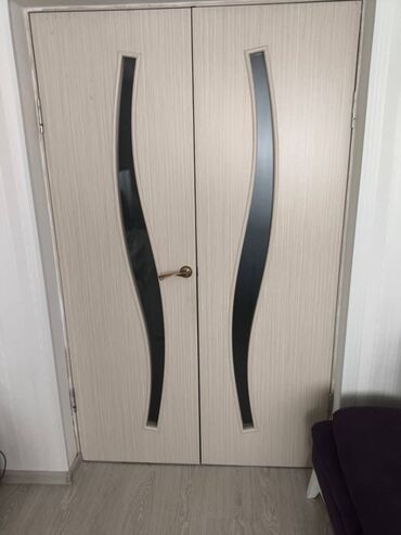 - Двухстворчатая дверь с декоративными вставками из темного матового стекла.