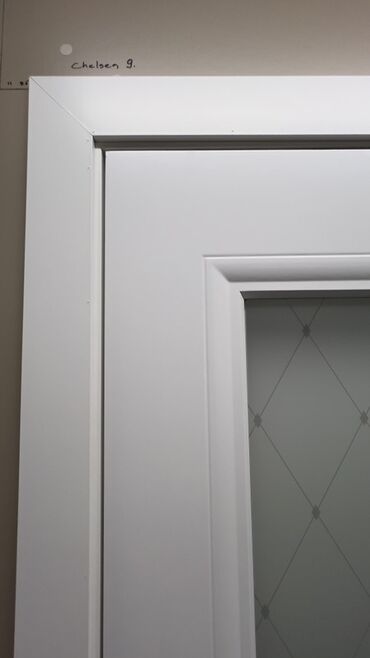 Белая межкомнатная дверь с матовым стеклом. Дизайн включает в себя