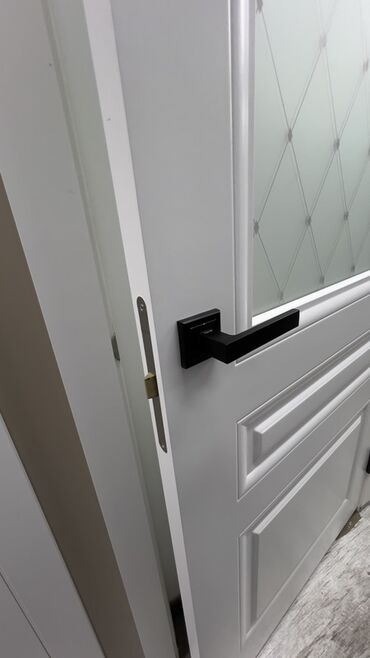 Две белые межкомнатные двери с прямоугольными филенками. Одна дверь с глухой филенкой, вторая – со стеклянными вставками. Обе двери оснащены серебристыми ручками и простыми петлями. Подходят для ус...