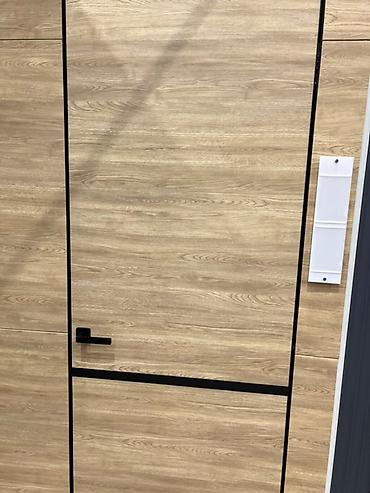 Межкомнатная дверь с гладкой белой поверхностью и минималистичным дизайном. Отличается прямоугольной формой и обрамлением с тонкими чёрными вставками, которые подчёркивают современный стиль. Оснащена чёрной матовой ручкой. Подойдёт для установки в жилых и офисных помещениях, где требуется простота и функциональность.