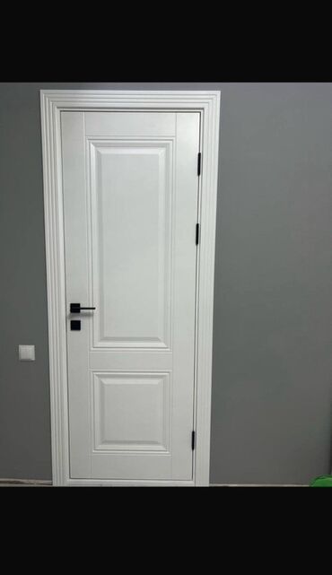 Белая межкомнатная дверь с двумя филенками и серебристой ручкой. Такая