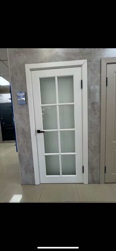 Межкомнатная дверь белого цвета с филенками и остеклением. Прямоугольная вставка из матового стекла с ромбовидным узором обеспечивает приватность, сохраняя при этом светопроницаемость. Конструкция ...