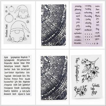 Разные варианты декоративных штампов для творчества, открыток, блокнотов, ежедневников, альбомов и hand-made проектов. Можно использовать с акриловыми блоками и штемпельными подушками. Темы на выбор: цветы, надписи, текстуры, календари, зимние сюжеты и др.