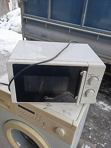 Белая микроволновая печь Midea с механическим управлением. Оснащена поворотными переключателями для выбора режима и времени приготовления. Имеет прозрачную дверцу с ручкой и внутреннюю камеру с поворотным столом, что обеспечивает равномерный нагрев пищи. Подходит для быстрого разогрева и приготовления различных блюд на кухне.