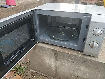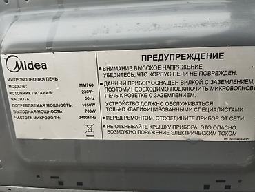 На задней панели — заводская наклейка с характеристиками и предупреждениями. Подходит для разогрева, приготовления и размораживания продуктов. Простое и надёжное управление без лишних функций.