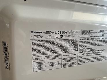 Микроволновая печь Hansa (модель на шильдике, сеть 230 В, 50 Гц). Белый корпус, фронтальная панель со стеклянным сенсорным управлением и цифровым дисплеем. Дверца с металлической ручкой и защитным экраном, декоративная рамка.