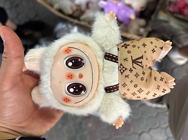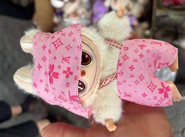 Милая коллекционная игрушка-кролик/йети с пухлым меховым костюмчиком и крупными выразительными глазами. Корпус мягконабивной, лицо из гладкого пластика с милой улыбкой и клычками, ушки торчком. Высота примерно 12–15 см — удобно держать в руке и брать с собой.
