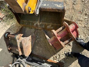 - Ковши: в комплекте видно как минимум два ковша — стандартный на машине и дополнительный узкий/планировочный (на фото в кузове).