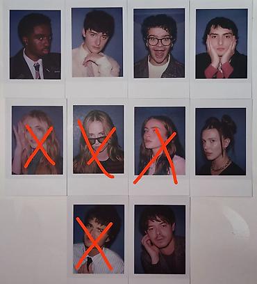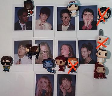 - Подборка моментальных снимков Instax (10×12 шт. формат Mini) с портретами актерского состава сериала. На некоторых фото проставлены красные кресты — отмечено отсутствие/резерв в подборке.