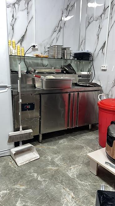 - Производственный стол-холодильник из нержавейки с тремя дверцами.