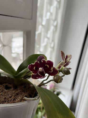 - Компактный фаленопсис с темно-бордовыми цветами и контрастным кремовым рисунком.