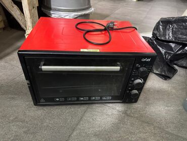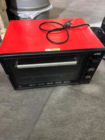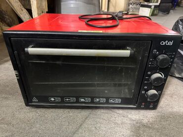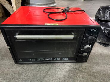 Мини-печь (настольная электрическая духовка) Arte . Компактный корпус, верхняя панель красного цвета, стеклянная дверца с металлической ручкой
