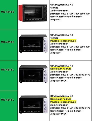 - MD-4218 L (с решеткой-направляющими) — объем 42 л, конвекция, таймер, двойной стеклопакет; размеры ?470 мм; цвета: серый, черный, белый, антрацит, INOX.