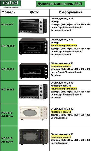 - MD-3618 L (вариант) — объем 36 л, конвекция, таймер, решетка-направляющие; размеры ?380 мм; цвета: серый, черный, антрацит.
