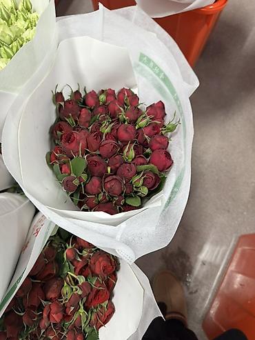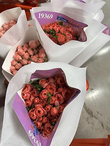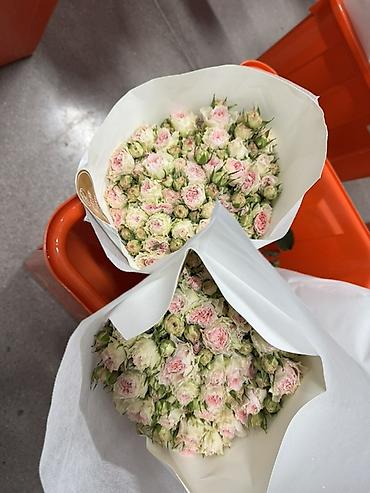 Букеты из кустовой розы - Варианты расцветок: нежно-розовая с кремовыми краями, классическая бархатно-красная, теплый персиково-розовый. - Каждый букет собран из множества мелких бутонов кустовой ...