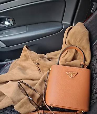 3) Prada, ведерко/mini bucket, цвет коньяк (saffiano leather). Верхняя ручка, съемный плечевой ремень, золотистая фурнитура, фирменный треугольный логотип.