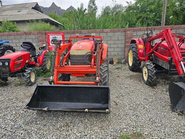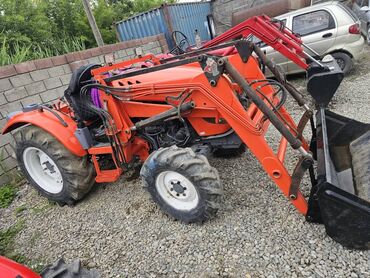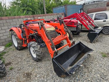 - Компактный колесный мини‑трактор с установленным фронтальным погрузчиком.