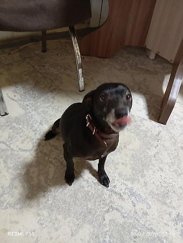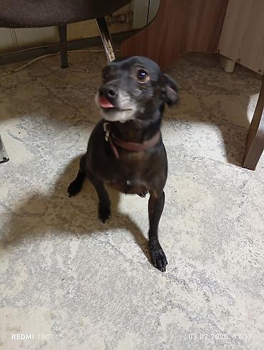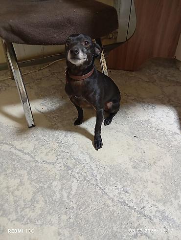 - Небольшая гладкошёрстная собака чёрного окраса с белыми отметинами на мордочке и груди