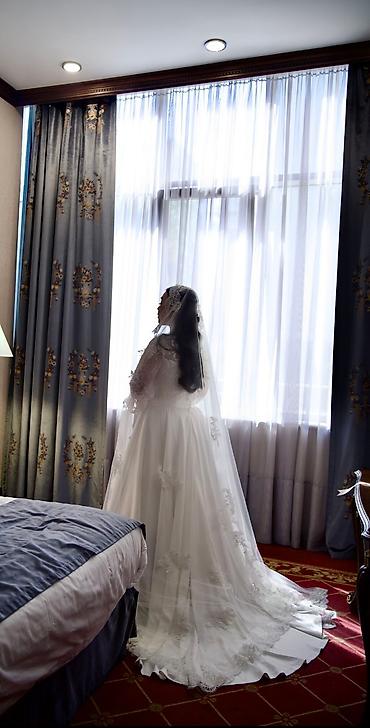Национальное свадебное платье в восточном стиле - Цвет: молочно‑белый - Силуэт: прямой, свободный, длина в пол с лёгким шлейфом - Особенности кроя: закрытый верх, длинные рукава, накидка‑капюш...